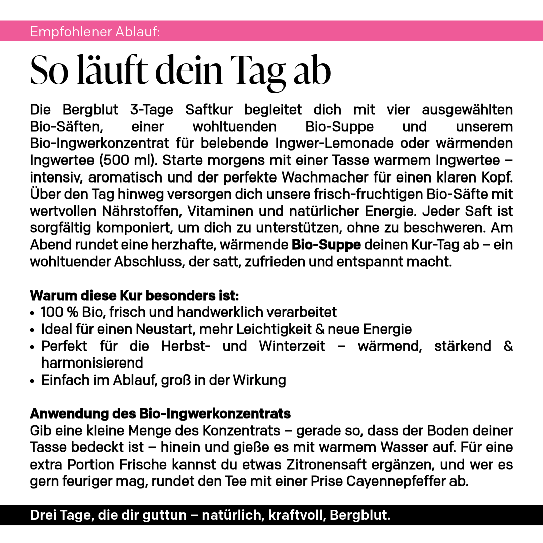 Die Bergblut Bio Saftkur Black Week schenkt dir drei Tage echte Leichtigkeit: vier frische Bio-Säfte, eine wärmende Bio-Suppe und unser Bio-Ingwerkonzentrat für den perfekten Start in den Tag. Handwerklich hergestellt, 100 % Bio, nährstoffreich und ideal für einen Reset in Herbst und Winter. Entlastet, stärkt und bringt dich zurück in Balance. Einfach im Ablauf – kraftvoll in der Wirkung.